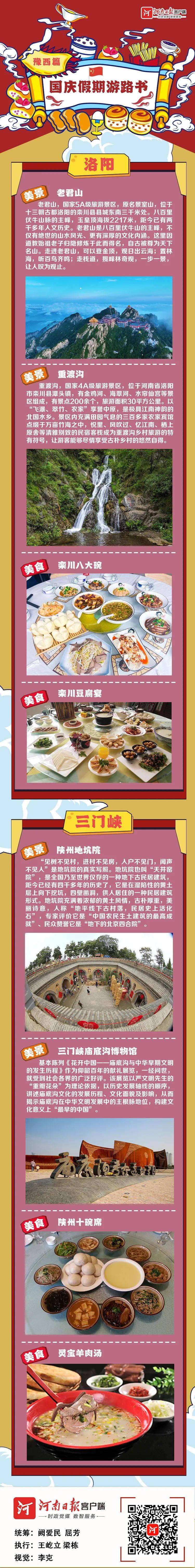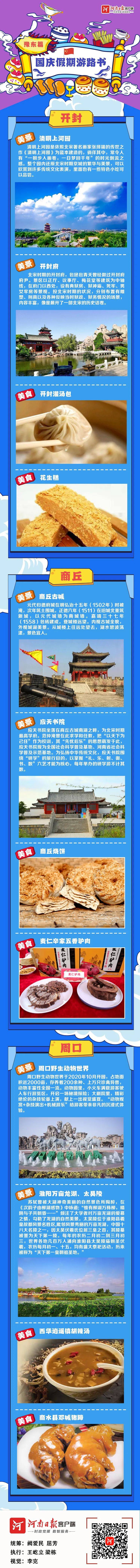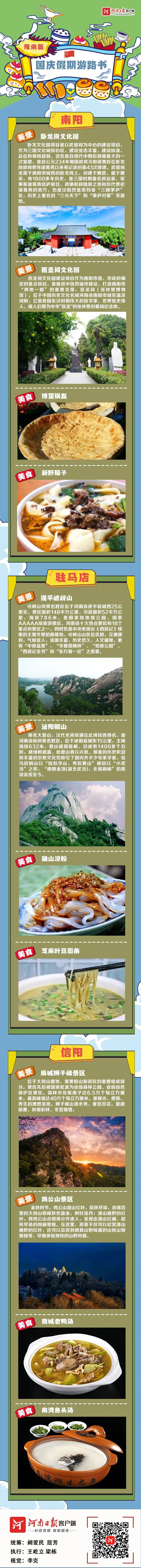 今年国庆长假,遵守就地过节的要求,大多数人会选择周边游、本地游、省内游,让我们看看豫中、豫北、豫南、豫西、豫东都有哪些值得停留的美景,不可辜负的绝味美食,在欣赏美景、饱尝美食中,寻找秋日的风情浪漫,感受家乡的壮美如画,祝福祖国更加强大。
