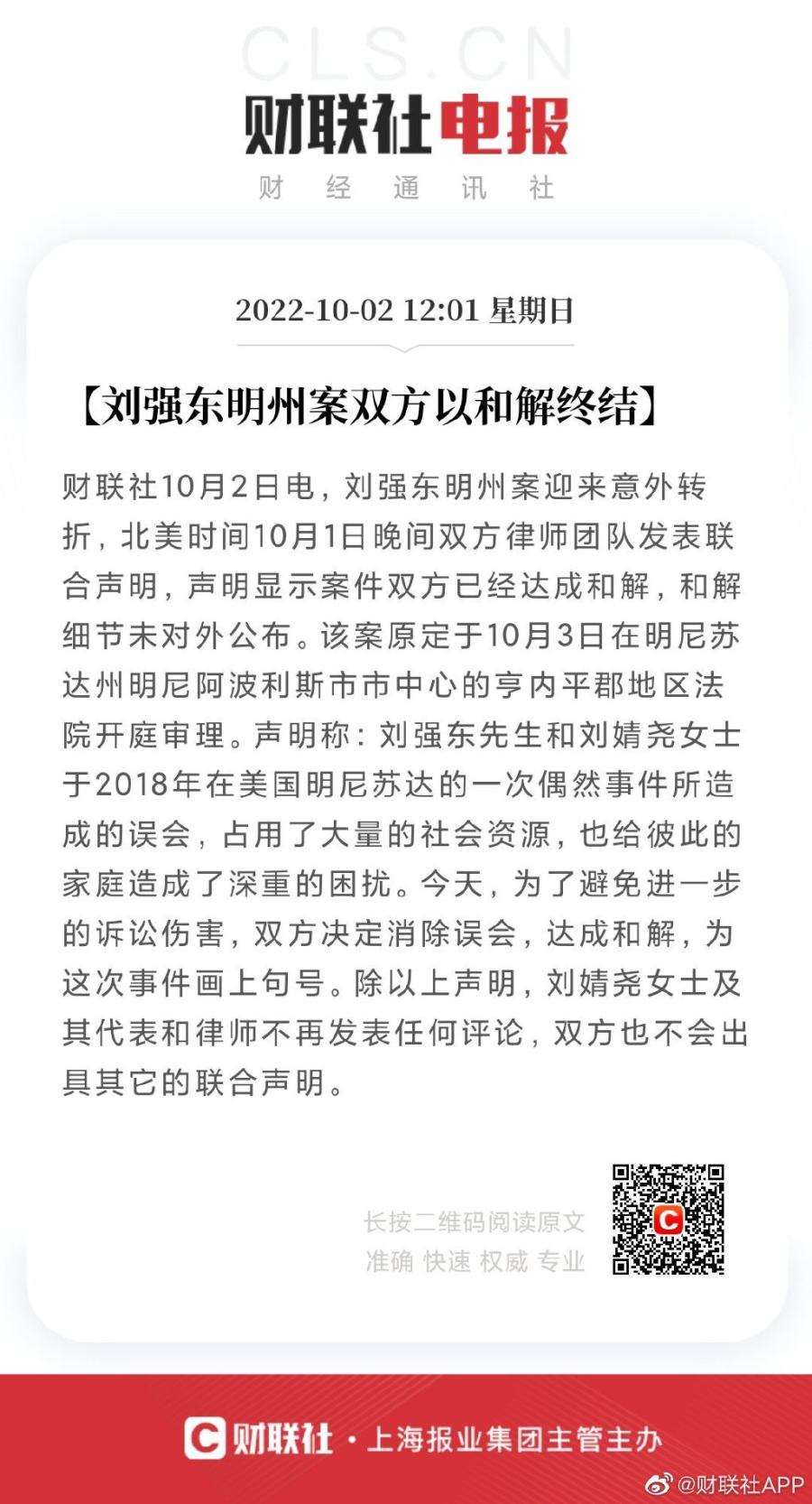 声明称:刘强东先生和刘婧尧女士于2018年在美国明尼苏达的一次偶然事件所造成的误会,占用了大量的社会资源,也给彼此的家庭造成了深重的困扰。今天,为了避免进一步的诉讼伤害,双方决定消除误会,达成和解,为这次事件画上句号。除以上声明,刘婧尧女士及其代表和律师不再发表任何评论,双方也不会出具其它的联合声明。