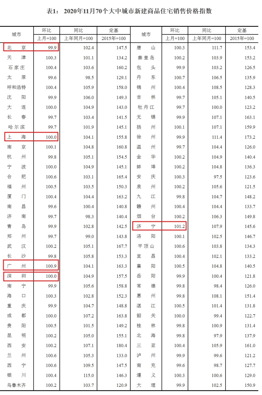 国家统计局14日公布11月份70个大中城市商品住宅销售价格变动情况,国家统计局城市司首席统计师绳国庆解读称,初步测算,11月份,4个一线城市新建商品住宅销售价格环比上涨0.2%,涨幅比上月回落0.1个百分点。其中,北京下降0.1%,上海和深圳持平,广州上涨0.9%。二手住宅销售价格环比上涨0.5%,涨幅与上月相同。其中,北京、上海、广州和深圳分别上涨0.5%、0.3%、0.8%和0.6%。