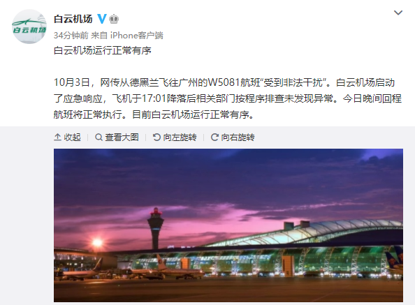 10月3日,网传从德黑兰飞往广州的W5081航班“受到非法干扰”。白云机场启动了应急响应,飞机于17:01降落后相关部门按程序排查未发现异常。今日晚间回程航班将正常执行。目前白云机场运行正常有序。