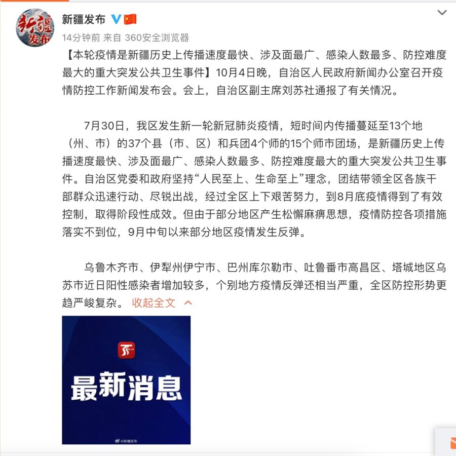 新疆:本轮疫情是新疆历史上防控难度最大的重大突发公共卫生事件