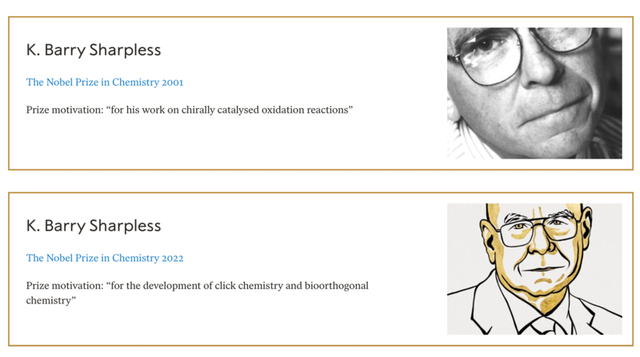 卡尔·巴里·夏普莱斯两度获得诺贝尔化学奖。诺贝尔奖官网截图
