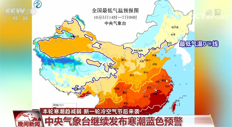 10月5日早晨,冷空气前锋已经抵达南岭一带,本轮寒潮降温幅度趋于减弱,中央气象台继续发布寒潮蓝色预警。预计8—10日,新一轮冷空气将影响中东部大部地区,多地气温偏低的情况仍将持续,大家注意添衣保暖。