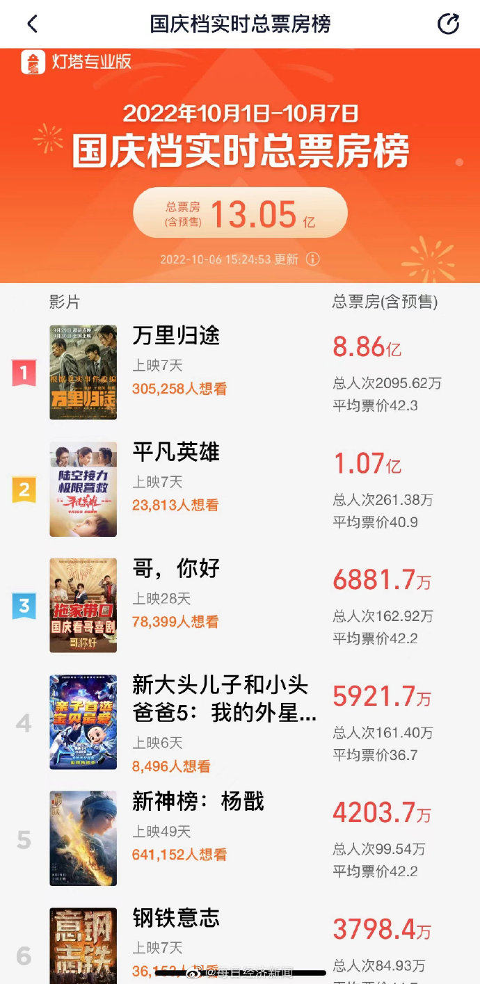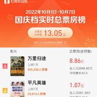 10月6日,据灯塔专业版数据,截至10月6日15时06分,2022国庆档(10月1日-10月7日)总票房(含预售)突破13亿元。