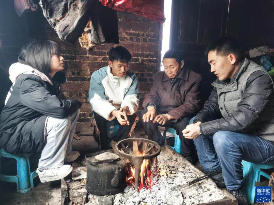 贵州省望谟县实验高中党总支副书记、副校长刘秀祥(右一)在学生家中家访(2022年2月1日摄)。新华社发