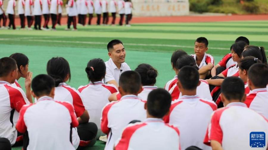 贵州省望谟县实验高中党总支副书记、副校长刘秀祥在新生军训间隙,和学生们聊天(2022年8月26日摄)。新华社记者 周宣妮 摄