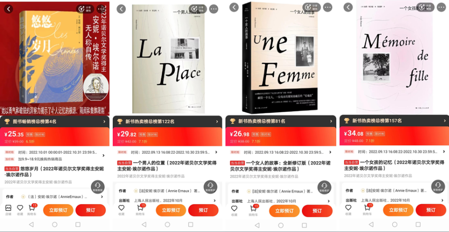 另外一家押题成功的出版社是上海人民出版社,在诺奖消息公布之前,上海人民出版社已引进了安妮·埃尔诺三本自传体小说,分别是:《一个男人的位置》、《一个女人的故事》和《一个女孩的记忆》,其中《一个男人的位置》、《一个女人的故事》分别在法国创造了50万和45万册的销量。