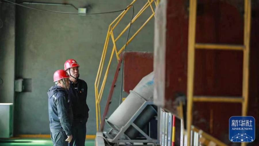 旦增顿珠(右二)和工友在检查设备(2022年7月13日摄)。新华社发