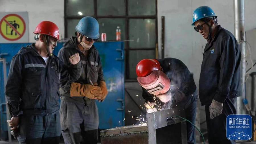 旦增顿珠(右二)和工友在维修设备(2022年7月13日摄)。新华社发