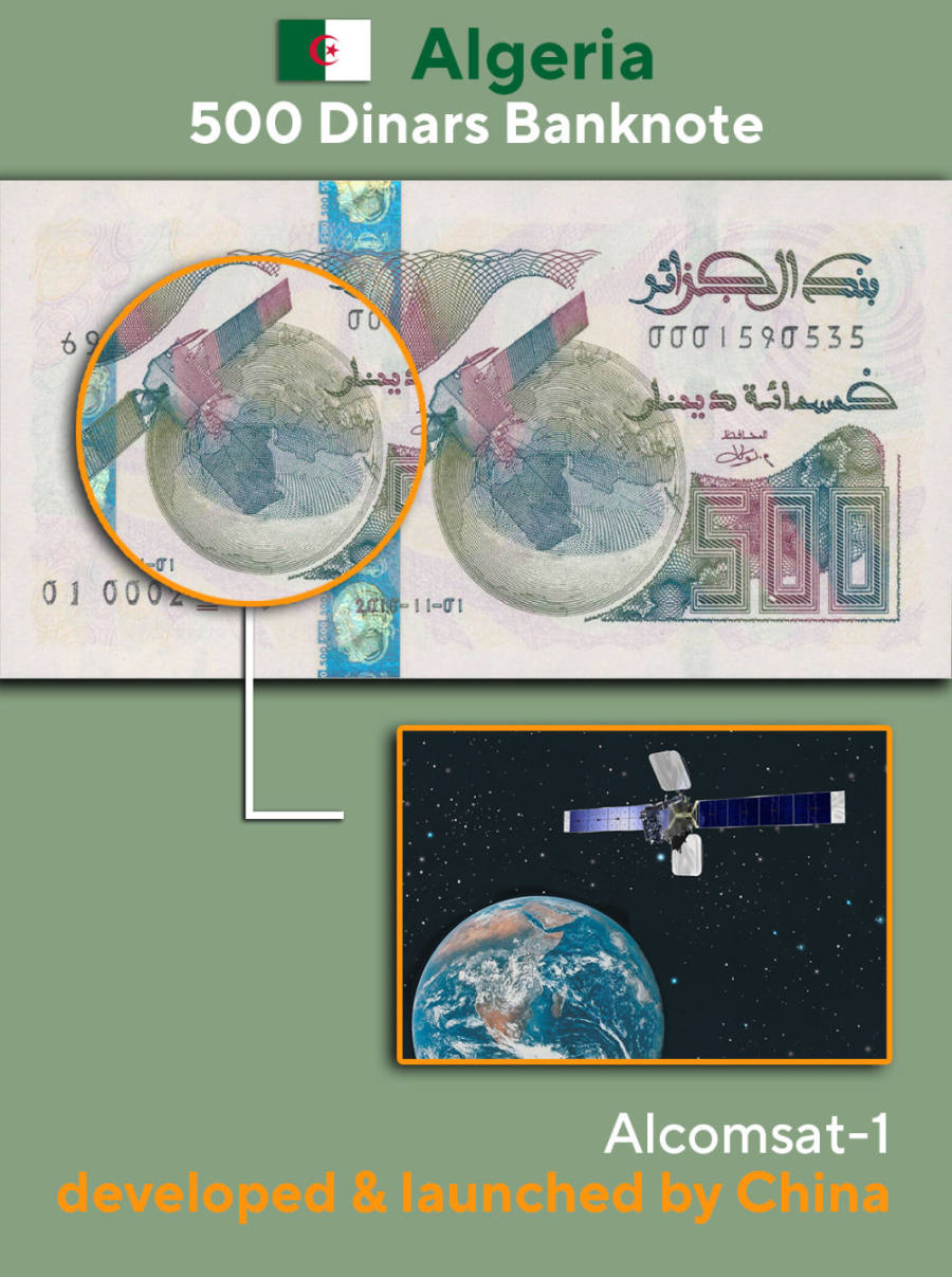 ▲阿尔及利亚面额500第纳尔纸币——阿尔及利亚一号通信卫星。