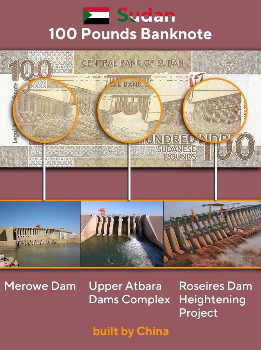 ▲苏丹面额100苏丹镑纸币——麦洛维大坝、上阿特巴拉水利枢纽和罗赛雷斯大坝。