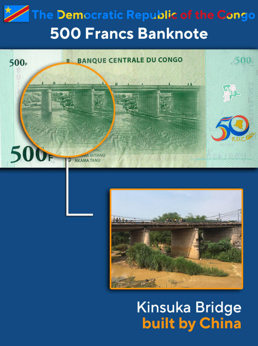 ▲刚果(金)面额500刚果法郎纸币——金苏卡大桥。