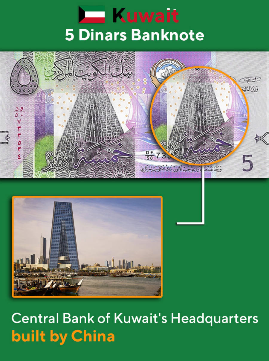 ▲科威特面额5科威特第纳尔——中央银行总部大楼。