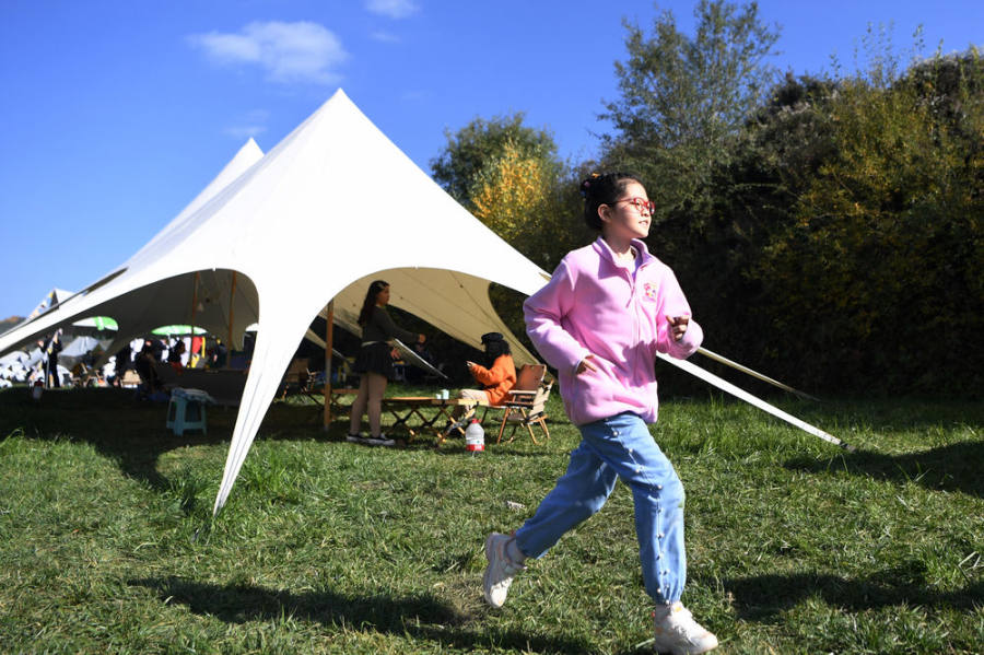 10月4日,市民在甘肃省兰州市石佛沟一处露营地休闲。新华社记者 陈斌 摄