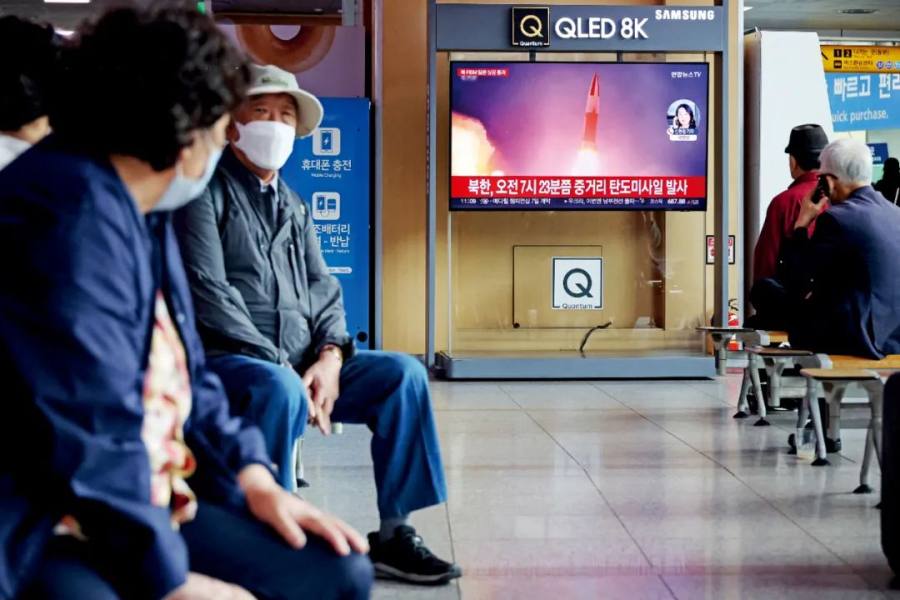 据韩国政府通报的信息,9月25日,朝鲜向半岛东部海域发射1枚短程弹道导弹,打破了此前113天的“导弹试射静默”。9月28日、29日及10月1日,朝鲜各试射了2枚短程弹道导弹。10月4日,朝鲜试射1枚中远程弹道导弹,飞越日本上空后落入太平洋。这也是时隔8个月朝鲜再次试射中远程弹道导弹。之后,朝鲜又于10月6日、9日各试射2枚短程弹道导弹。此外,朝韩双方空军还在6日、8日各自进行了大规模空中演训,并一度在空中对峙。10月4日,韩国首尔的一处车站候车厅播放朝鲜发射导弹的报道。图/澎湃影像