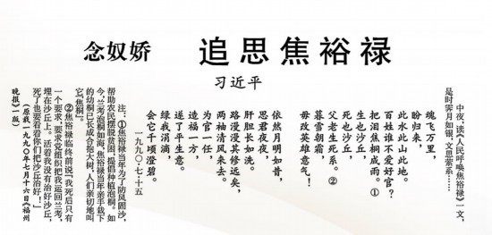 “生也沙丘,死也沙丘,父老生死系。暮雪朝霜,毋改英雄意气!”2014年3月,习近平在兰考县委常委扩大会议上,吟诵了1990年7月创作的《念奴娇·追思焦裕禄》,他说:“这首词我是有感而发,直抒胸臆。”