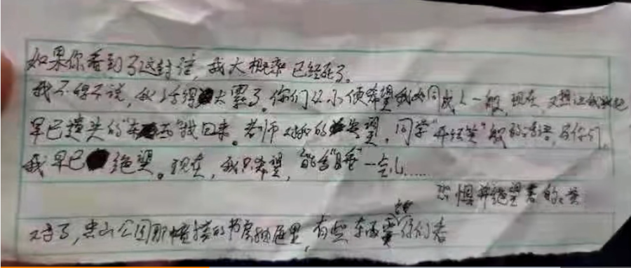 12月15日,四川泸州一小区内,一小学生跳楼自杀。疑似男孩跳楼前留下的字条上“我活得太累了”“只希望能多睡一会”“我早已绝望”等字眼格外让人心疼。目前,公安机关已经介入调查,具体情况有待进一步通报。
