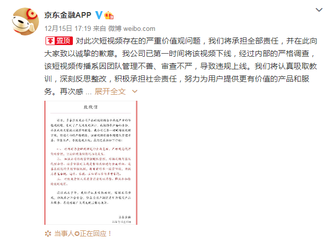 12月15日,@京东金融APP 发文致歉称,对此次短视频存在的严重价值观问题,将承担全部责任,并向大家致以诚挚的歉意。