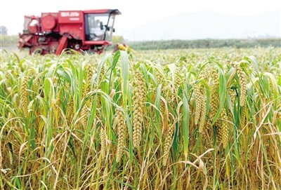 9月21日,在河南省洛阳市伊滨区寇店镇二教塔社区,收割机在地里收割谷子 新华社发(张怡熙 摄)