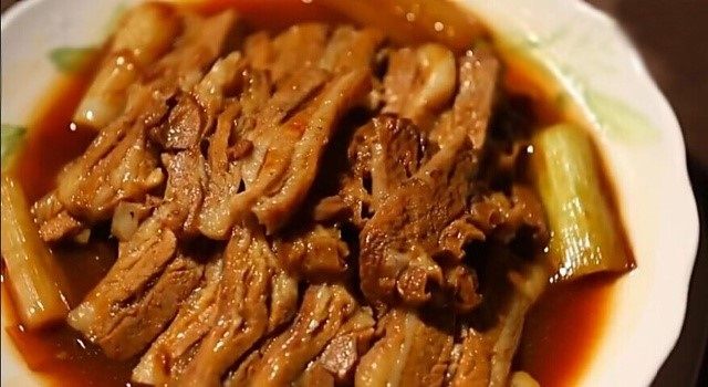 做法:首先将羊肋条肉洗去血污,放清水中加葱、料酒煮至断生后捞出,切大片;然后在锅内放清油,下入大葱段炸至金黄色捞出,再用锅内葱油下生姜炒出香味,入羊肉汤,放入排好的羊肉、料酒、盐、胡椒粉、酱油、鸡精,用小火扒至羊肉酥烂。最后用锅内余汁勾芡后浇在羊肉上出锅。这样吃起来味道鲜美,油而不腻。