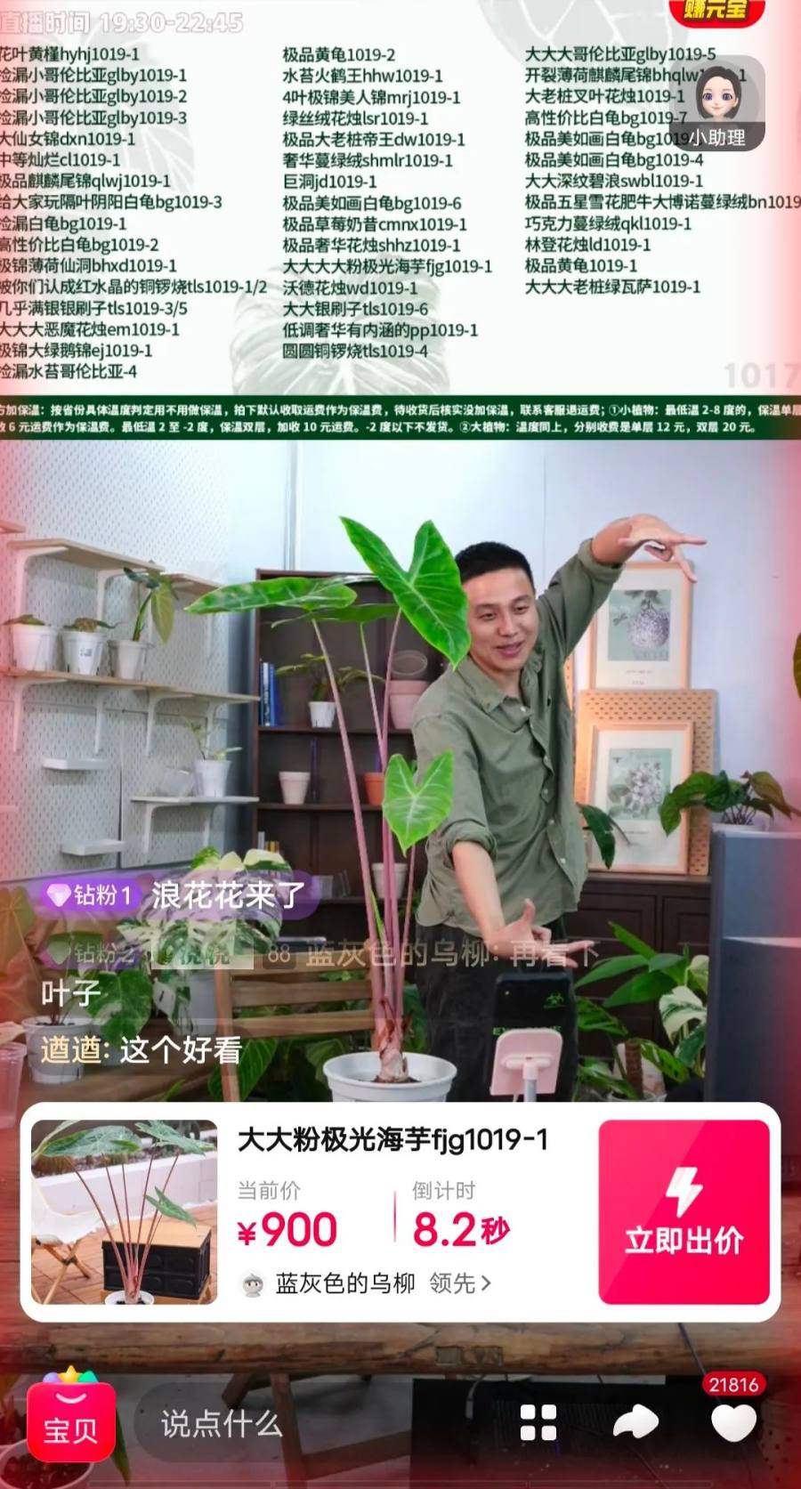 ▲19日晚,某直播间在对绿植进行拍卖 来源:电商平台