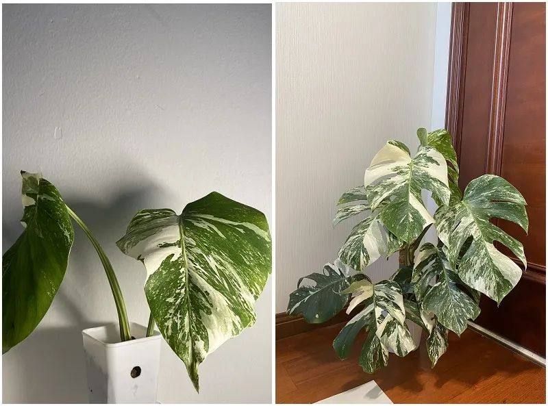去年夏天,一株9片叶子的姬龟背在新西兰拍卖网站上以超12万元的价格成交。此后绿植火到中国国内,价格也水涨船高。据媒体报道,2021年,北京当时新房一平米的价格都买不了一株橙柄锦,其价格约在9万元左右。橙柄锦是蔓绿绒的一种,被称之为绿植圈的“爱马仕”。80后金融从业者洪阳(化名)在国内刚刚兴起绿植的时候也入手了一株,只有4片叶子,花费了2万多元。洪阳是被某社交平台和国外绿植网站种草的,刚开始那阵是一盆接着一盆买,“基本上天天收快递,一年多买了七八十盆。”95后杰瑞(化名)在去年秋天加入绿植圈,一年多来大概买了100盆,目前存活的在80盆左右。杰瑞买过最贵的绿植是白锦龟背竹顶芽,两片叶子花费了1200元。“当时做了很长时间的心理建设,以前买绿植均价都在五六十,从来没买过这么贵的,朋友当时戏称我‘神经病’,但最后我还是买了,可能是当时刚好发了年终奖。”▲杰瑞买的最贵的绿植,左图为刚买来两片叶子的状态,右图为当前的生长状态 来源:受访者供图