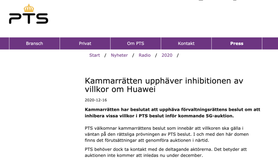 华为瑞典于11月5日就拍卖附加条件向瑞典斯德哥尔摩行政法院提起上诉,法院于11月9日颁发临时禁止令,叫停附加条件。瑞典电信监管局随即决定延迟拍卖,并于11月16日针对临时禁止令向上诉法院提出上诉。
