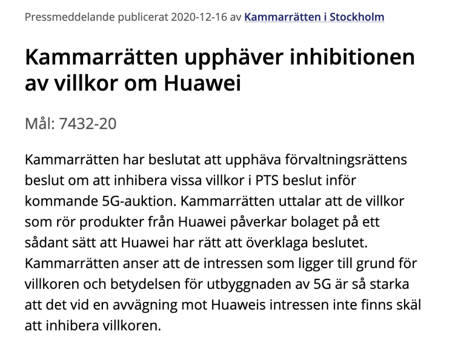 当地时间12月16日,斯德哥尔摩上诉法院裁决斯德哥尔摩行政法院颁布的临时禁止令被停止,但华为有权上诉瑞典电信监管局(PTS)。