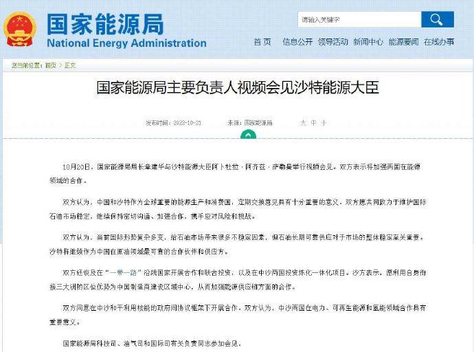 国家能源局主要负责人视频会见沙特能源大臣
