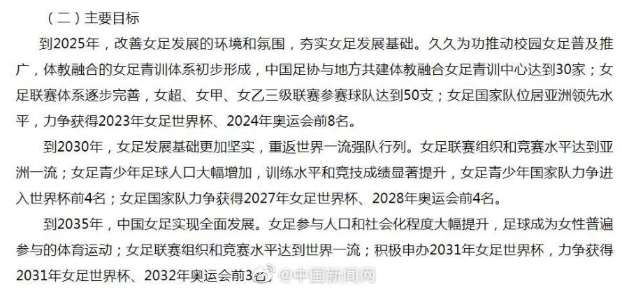 《通知》中指出,到2025年,女足国家队位居亚洲领先水平,力争获得2023年女足世界杯、2024年奥运会前8名。到2030年,女足国家队力争获得2027年女足世界杯、2028年奥运会前4名。到2035年,中国女足实现全面发展。此外,中国将积极申办2031年女足世界杯,中国女足力争获得2031年女足世界杯、2032年奥运会前3名。