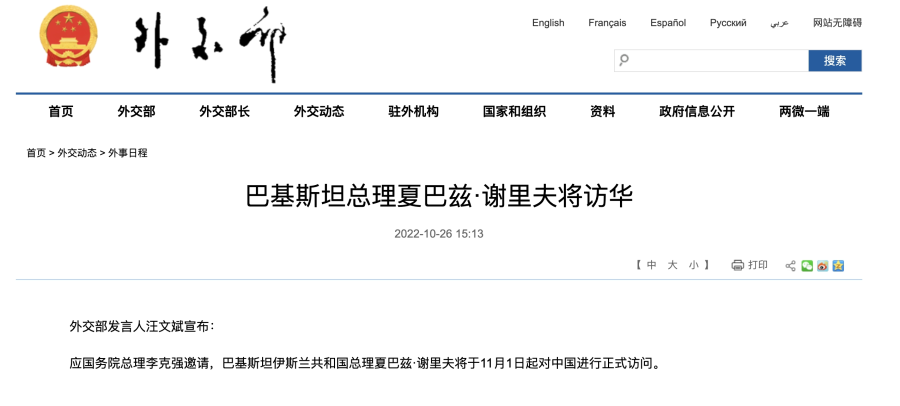 应国务院总理李克强邀请,巴基斯坦伊斯兰共和国总理夏巴兹·谢里夫将于11月1日起对中国进行正式访问。