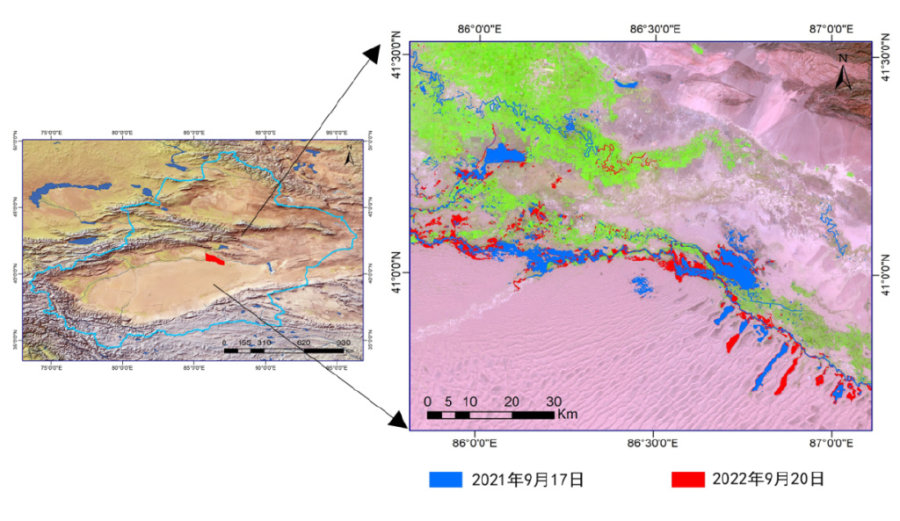 2021年9月17日至2022年9月20日,塔里木河下游水情遥感监测图 图/新疆自治区生态气象和卫星遥感中心