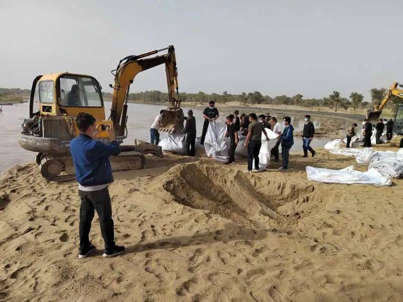 9月以来塔里木河流域出现警戒洪水,当地工作人员围堵河道决口,防止大量洪水流入沙漠 图/斯迪克
