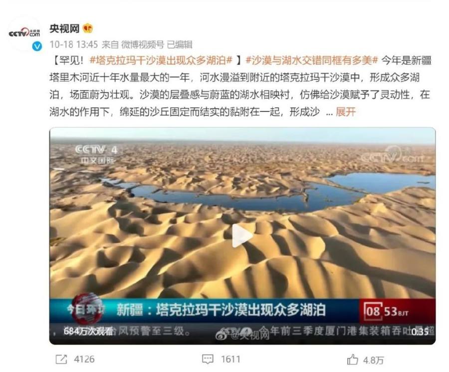 一条“新疆塔克拉玛干沙漠里出现众多湖泊”的