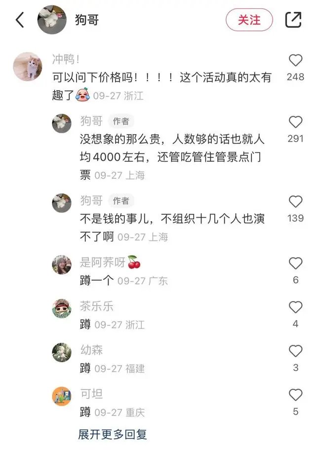 同时他也提到,拍摄的费用摊到每位阿姨身上是4000元左右,“一共三天两晚,包括吃、住、行、景点门票,还有包剧组的费用。”他表示后续还会“翻拍”《情深深雨濛濛》,“正在攒人。”