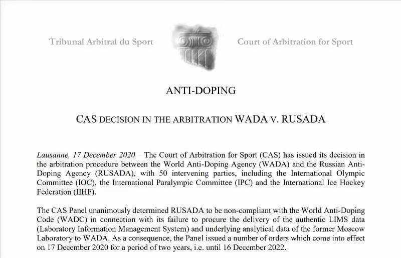 北京时间今晚11时,国际体育仲裁法庭(CAS)宣布,认定俄罗斯反兴奋剂中心违规,并对俄罗斯反兴奋剂中心(RUSADA)处以为期两年的一系列处罚。2020年12月17日至2022年12月16日的两年间,俄罗斯将不得参加包括东京奥运会及各项目世界锦标赛在内的重大国际体育赛事。