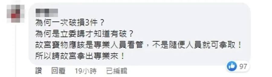 有网友表示:“怎么一到你们手中就连破3个,你们对得起用生命护送的前辈吗?”“为什么会打破呢?故宫不是都有铺厚地毯各种保护的设备吗,是否可以说明后续是怎么补强保护设备、文物移动流程,确保下次不会再发生呢?”“为何一次破损3件?为何是‘立委’讲才知道有破?”。