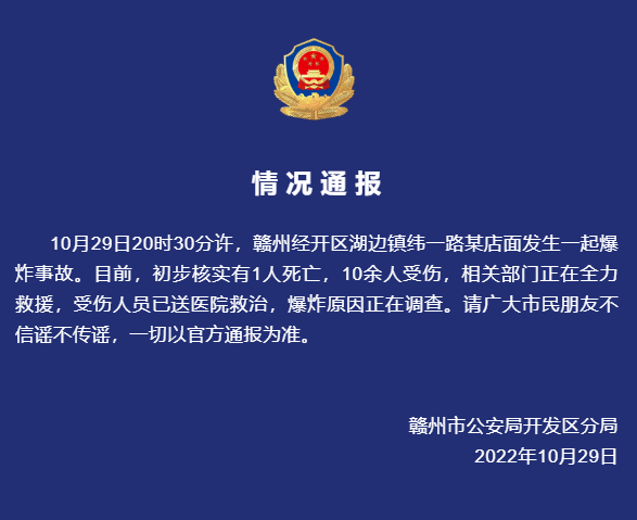 10月29日20时30分许,江西赣州经开区湖边镇纬一路某店面发生一起爆炸事故。目前,初步核实有1人死亡,10余人受伤,相关部门正在全力救援,受伤人员已送医院救治,爆炸原因正在调查。请广大市民朋友不信谣不传谣,一切以官方通报为准。
