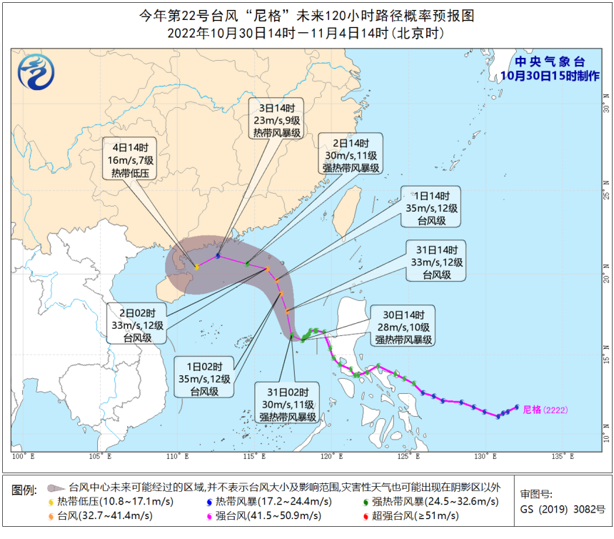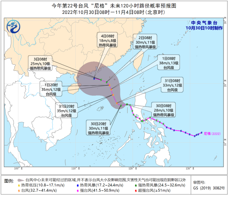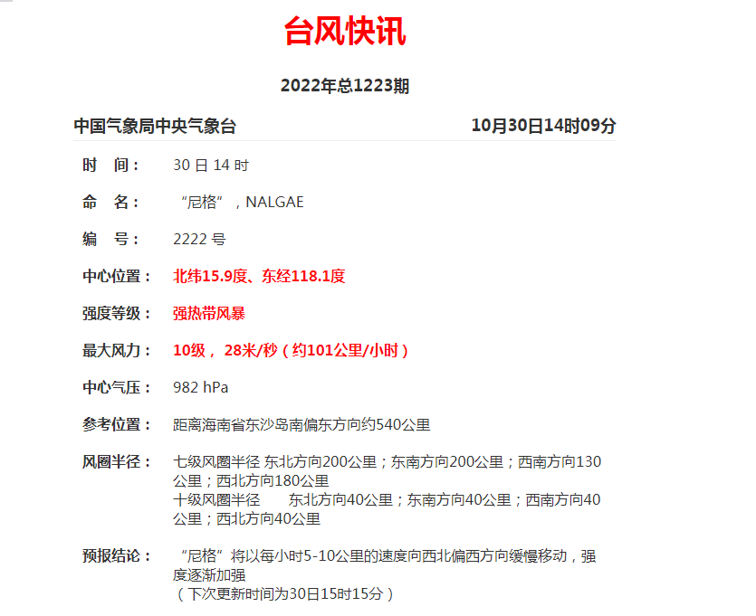 海洋方面:南海中东部和东北部海面,中沙群岛附近海面,30日白天,风力10~11级、阵风12~13级;30日夜间到31日,风力11~12级、阵风13~14级,其中“尼格”中心经过的附近海面旋转风12~13级、阵风14~15级;11月1日,风力7~8级、阵风9~10级;11月2日—3日,风力6~7级、阵风8~9级。