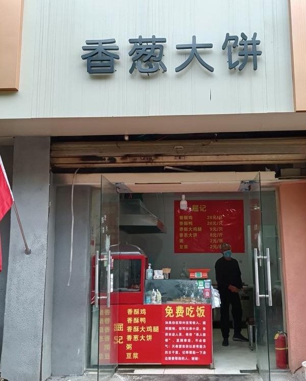 这家小店以卖香葱大饼为主,同时也会卖一些香酥鸡、香酥鸭。店铺门口一块醒目的红色招牌上,写着“免费吃饭”四个大字。