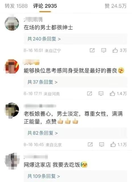 八月的郑州,一条 #店主遇女孩衣衫不整进店帮穿衣# 的话题迅速登上各平台热搜:男顾客看了女子一眼便低头的绅士行为、店主帮忙穿衣递水的关心之举获网友称赞。有网友评论道“在场的男士都很绅士!”“老板娘善心,男士淡定,尊重女性,满满正能量,点赞!”“‘网暴’这家店我要去吃饭!”“咱河南人就是中!”……