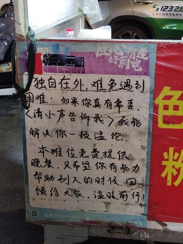 2008年来郑州后,阿俊做过厨师,进过工厂,最终选择在一家电器公司工作,并在下班后兼职卖炒饭。2019年11月,阿俊在自己的摊位上贴了一张告示:只有短短的8个字——“如有困难,免费吃饭”,但是后来他发现,很多人拉不下面子。后来,阿俊对告示上的字做了调整,“有些人是真的遇到困难了,生活各种受挫,不能让人家自尊心也受挫,所以就在告示上加了一句‘请小声告诉我’。”