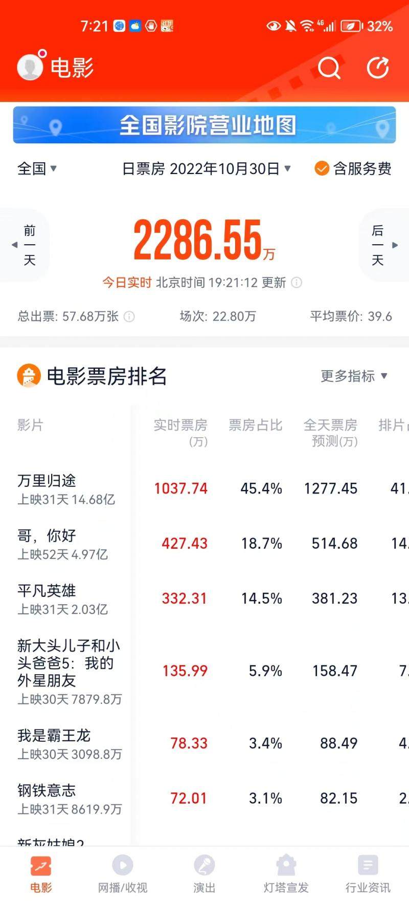 目前电影市场正在上映的热门影片为根据真实事件改编的电影《万里归途》,该片9月30上映,密钥延期也是“毫无悬念”,放映延长至11月30日,目前票房为14.67亿,该片上映31天后,单日票房依然在增长,10月30日当天票房达到1000万,外界寄希望该片最终能够突破二十亿大关。而与《万里归途》同日上映的《平凡英雄》密钥将延期至11月28日,目前票房突破2亿。
