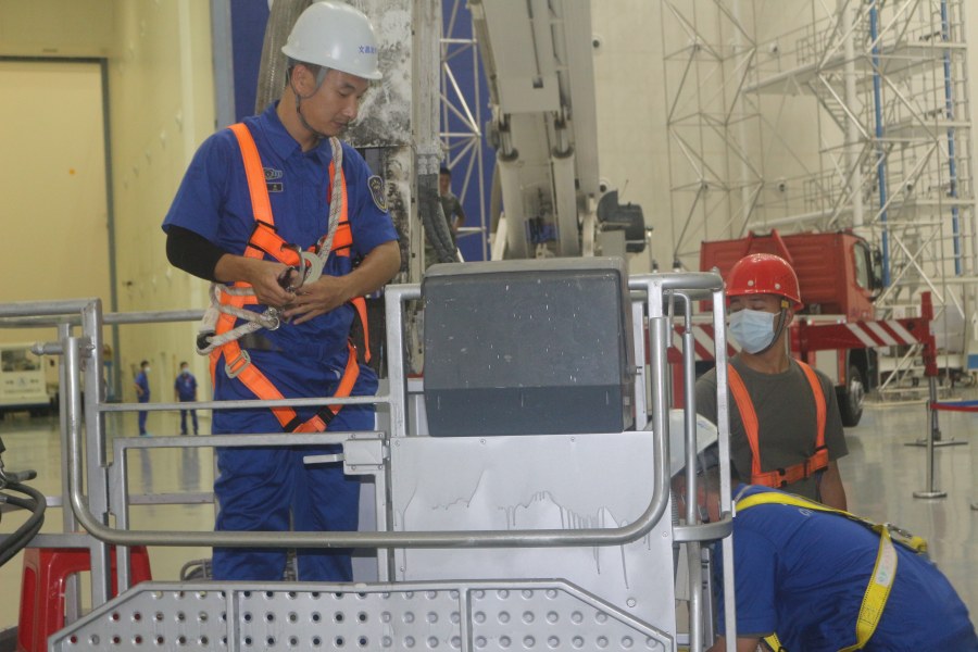梦天试验舱进场前,岗位人员发现垂直总装加注厂房监视摄像机突发故障,由于该摄像机内部防爆型重量高达30千克,且摄像机安装于距地面30米高处,普通的高空作业车根本无法触及。凭借多年工作经验,张帅敏锐地判断出故障症状,主动请缨,来回上下于高空云梯车,汗水浸湿了工作服,白花花的汗渍布满了后背。在长达2个小时的精准施工下,故障被及时排除,他为梦天试验舱进场图像保障立下了汗马功劳。