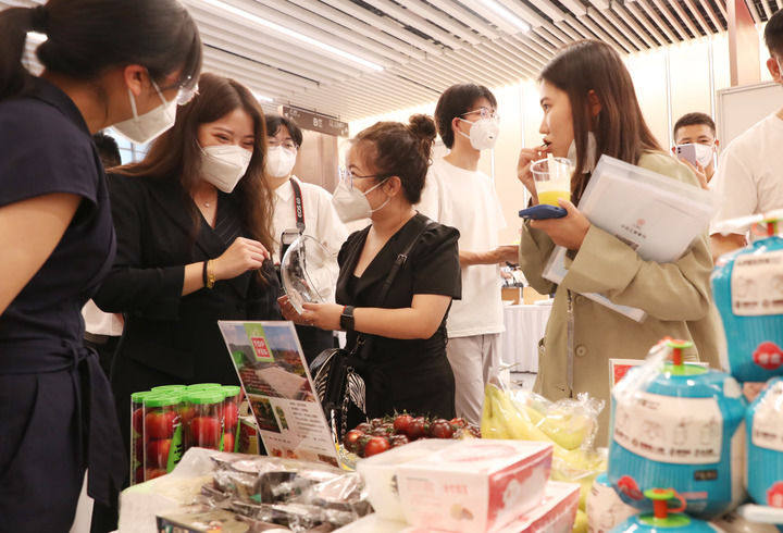 2022年8月30日,第五届进博会食品和医疗展区展前供需对接会嘉宾在参展企业展位前品尝水果。