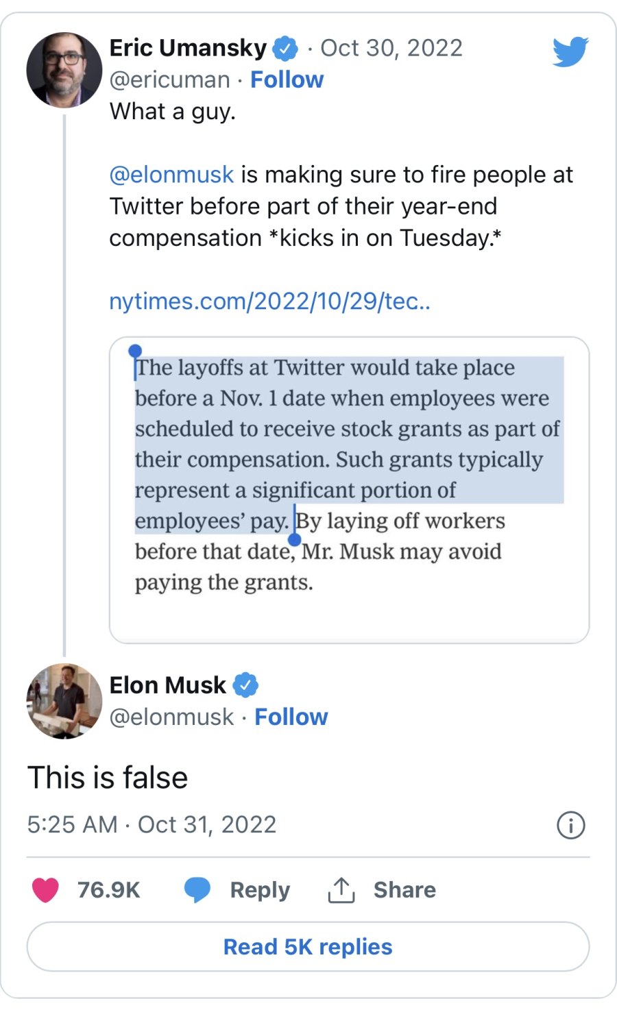 ProPublica的副执行主编埃里克·乌曼斯基(Eric Umansky)发布推文称,“马斯克一定要在周二发放推特员工的部分年终奖金之前解雇他们”。马斯克在回应这条推特时表示“这是错误的”,但他没有澄清具体哪些内容是错误的。