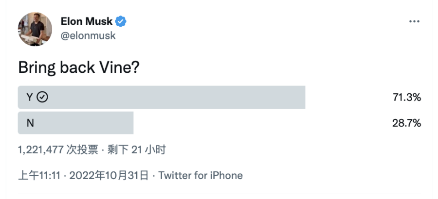 除了对现有业务进行修整,马斯克还将目光投向大火的短视频赛道。北京时间10月31日11时11分,马斯克在推特发起投票,询问是否应该恢复推特的短视频应用Vine。截至13时53分,有超7成网友选择“是”。