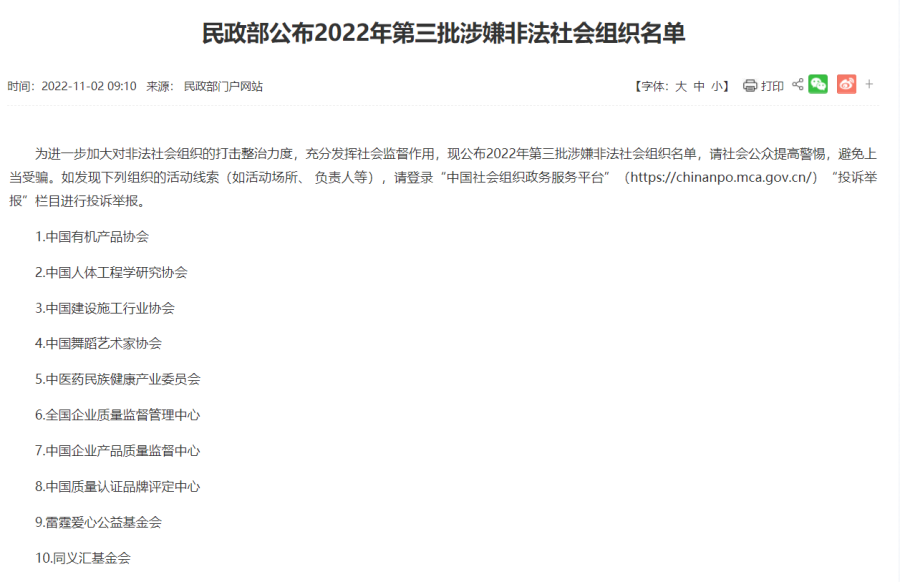 民政部网站2日公布了2022年第三批涉嫌非法社会组织名单:1.中国有机产品协会;2.中国人体工程学研究协会;3.中国建设施工行业协会;4.中国舞蹈艺术家协会;5.中医药民族健康产业委员会;6.全国企业质量监督管理中心;7.中国企业产品质量监督中心;8.中国质量认证品牌评定中心;9.雷霆爱心公益基金会;10.同义汇基金会。