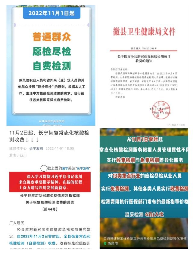 更早一些,甘肃陇南下属的徽县于9月5日宣布恢复核酸检测收费,同为陇南下属的文县、成县和酒泉下属的金塔县也都先后于10月底发布通告,宣布恢复常态化核酸检测收费,收费标准单人单检16元/人次,多人混检 4元/人次。