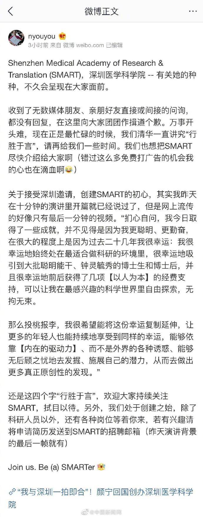 2日,颜宁@nyouyou 在微博平台发文对此进行回应。据知情人士证实,账号@nyouyou 是著名科学家颜宁的微博账号。